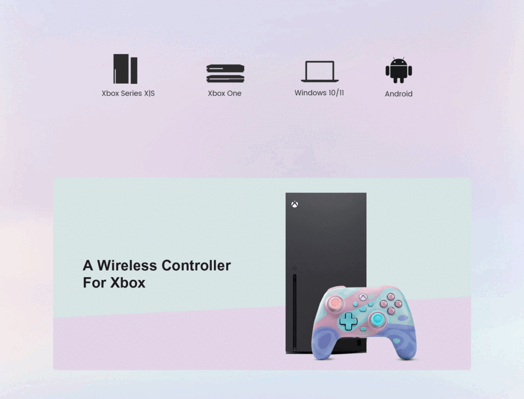 GameSir T7 Pro Sugar Whirl Wireless Controller of the xbox comes with two back buttons, an audio jack, four rumble motors and a six axis gyroscope. The controller is compatible with the Xbox Series S|X, the Xbox one, and the PC through 2.4GHz wireless and USB-C wires, and Android through Bluetooth.