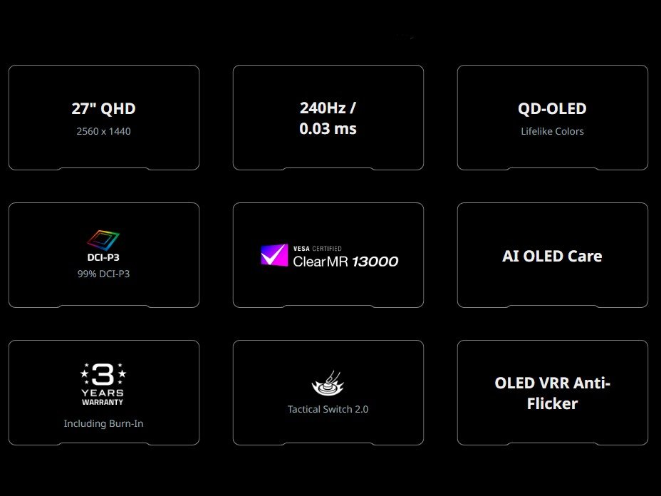 It has other characteristics such as a refresh rate of 240 Hz and a response time of 0.03 ms, which is very fast and makes it perfect with the competitive gamers. It also carries a few exclusive features such as Tactical Switch 2.0 that allows you to switch between various display sizes and aspect ratios, a black boost feature and a night vision mode. In addition, the monitor has an adjustable stand that is fully adjustable, a three-year warranty on the OLED, and a good range of ports, including a DisplayPort 1.4 and a USB-C port with DP Alt Mode and 15W charging.