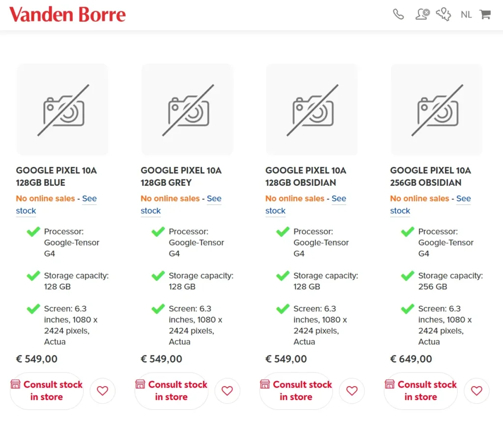 Vanden Borre has also disclosed the Pixel 10a’s pricing and color options. The smartphone will be available in Blue, Grey, and Obsidian finishes. The retailer lists the 128 GB model at €549 ($650) and the 256 GB variant at €649 ($769). While the screenshot below shows the 256 GB version in Obsidian, it’s expected to be available in other colors as well.
