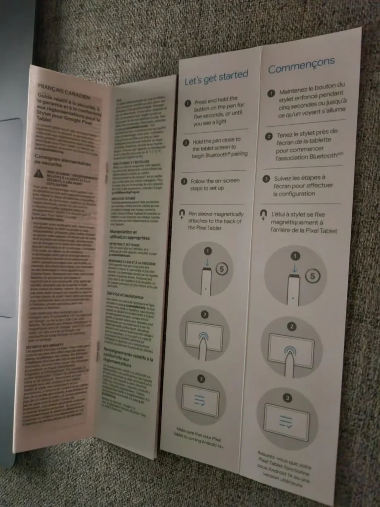 The manual, as you would expect, has tips on the use of the stylus. It entails the guidelines of pairing the Pen via Bluetooth. Going by the step by step guide, you would be required to press and hold on the button on the end of the Pen to a period of five seconds or a light. You would then need to follow onscreen instructions at the same time holding the stylus near the tablet. It also states that the device would have to be operating on Android 14 and above.